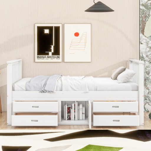 Funkcja przechowywania: Łóżko posiada cztery szuflady i szafkę do przechowywania w dolnej części łóżka. Szuflady można łatwo wsuwać i wysuwać, aby przechowywać ubrania lub pościel dziecka, dzięki czemu Twój pokój będzie schludny i piękny.