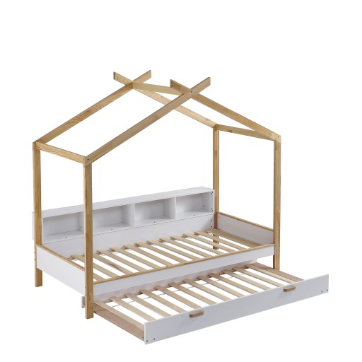 Łóżko domek, łóżko dziecięce z czterema półkami przegródkowymi, z wysuwanym łóżkiem wysuwanym, łóżkiem pojedynczym, łóżkiem drewnianym, ramą sosnową, MDF, biały + naturalny, 90x200cm i 90x190cm