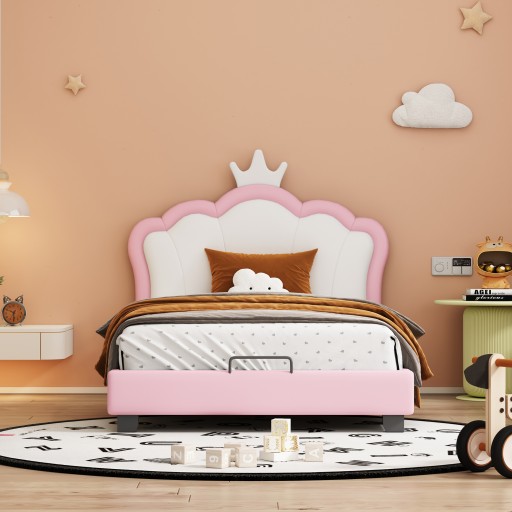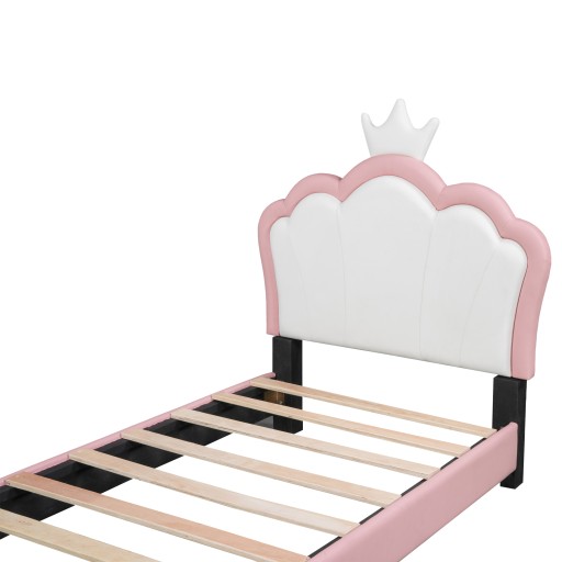 Łóżko dziecięce łóżko tapicerowane 90*200cm z ramą listwową i oparciem, łóżeczko dla dziewczynki z kształtem korony, różowe (materac nie jest częścią zestawu)