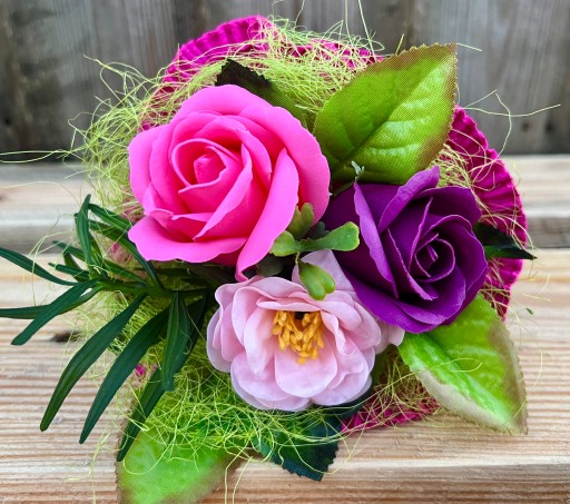 ❤️ piękne pachnące, duże mydlane kwiaty w odcieniach różu i fioletu w otoczeniu ozdobnego sizalu i sztucznych dodatków zielonych, całkowita wysokość i średnica to około 18 - 20 cm,