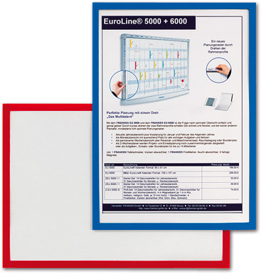 Ramka magnetyczna formatu A4 niebieska 210 x 297 mm z frontu pokryta folią PCV doskonała do prezentacji dokumentów na powierzchniach metalowych, zwłaszcza na tablicach magnetycznych.