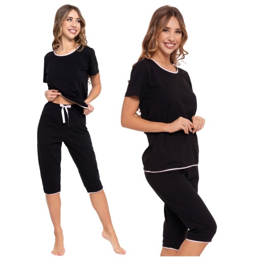 Zachęcamy do poznania naszej nowoczesnej i komfortowej dwuczęściowej piżamy damskiej, która łączy w sobie wyjątkowy design z przyjemnością noszenia. Ta piżama składa się z koszulki z okrągłym dekoltem i krótkim rękawem, oraz spodni 3/4 w kolorze czarnym z uroczymi różowymi wykończeniami.