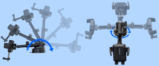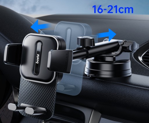 Jego konstrukcja ułatwia obsługę jedną ręką oraz umożliwia ustawienie telefonu w pozycji pionowej i poziomej, a różne opcje montażu — przyssawka lub hak na kratkę nawiewu — oferują elastyczność instalacji. Regulowane teleskopowe ramie (16-21cm) i możliwość obrotu osi o 270°/360° pozwalają na idealne ustawienie smartfonu. Wycięcie na kabel ładowarki umożliwia ładowanie bez wyjmowania urządzenia, co jest kluczowe podczas długich tras.