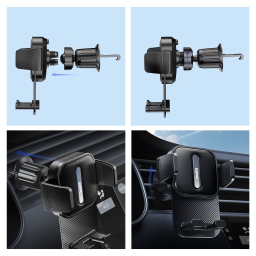 - Regulacja uchwytu: Po zamontowaniu uchwytu na kratce wentylacyjnej, możesz dokonać drobnych regulacji pozycji, aby zapewnić najlepszy widok na urządzenie oraz łatwy dostęp do ekranu i portów ładowania.