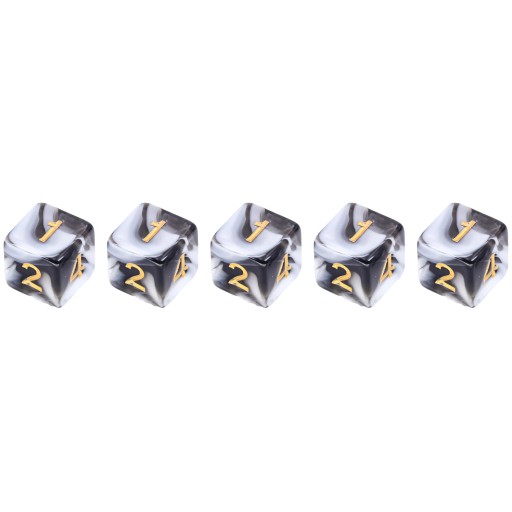 Komplet pięciu kości sześciościennych. Niezwykle wysoka jakość odlewu, precyzja żłobienia oraz malowania numerów czynią z nich podstawowy wybór dla wielu graczy, zarówno początkujących, jak i zaawansowanych.