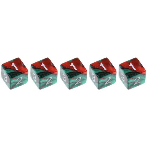 Komplet pięciu kości sześciościennych. Niezwykle wysoka jakość odlewu, precyzja żłobienia oraz malowania numerów czynią z nich podstawowy wybór dla wielu graczy, zarówno początkujących, jak i zaawansowanych.