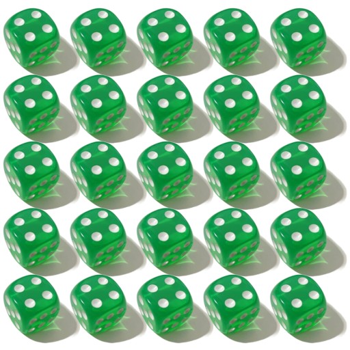 Komplet dwudziestu pięciu kości sześciościennych. Niezwykle wysoka jakość odlewu, precyzja żłobienia oraz malowania numerów czynią z nich podstawowy wybór dla wielu graczy, zarówno początkujących, jak i zaawansowanych.
