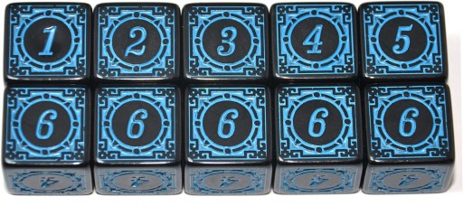 Komplet dziesięciu kości sześciościennych. Niezwykle wysoka jakość odlewu, precyzja żłobienia oraz malowania numerów czynią z nich podstawowy wybór dla wielu graczy, zarówno początkujących, jak i zaawansowanych.