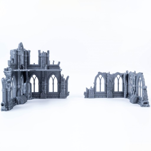 Zrujnowana Katedra składa się z trzech modułowych elementów, które można dowolnie ustawiać, aby dopasować je do swoich potrzeb. Można je układać w stosy, tworząc wysokie konstrukcje dominujące nad krajobrazem, lub używać ich pojedynczo, tworząc mniejsze ruiny na poziomie gruntu, które zapewniają schronienie i intrygę. Możesz je również łączyć z innymi zestawami z linii Gotyckich Ruin, aby stworzyć nieskończone wariacje.