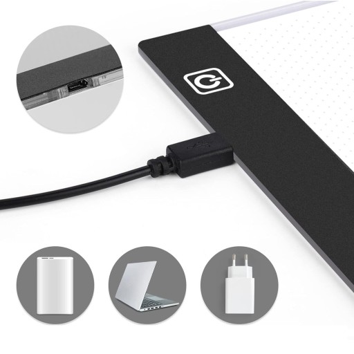 🖌️ Ultracienka podkładka oświetleniowa LED A4: Ultra-cienka konstrukcja, stół świetlny ma tylko 4 mm grubości, bardzo lekki, lekki i przenośny, można łatwo umieścić LED light pad A4 w plecaku.