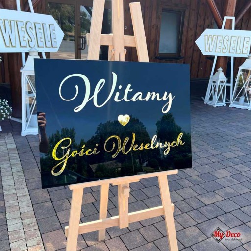 Nasza Tablica Powitalna na ślub to nie tylko ozdoba to prawdziwe dzieło sztuki, gdzie elegancja idzie w parze z solidnością wykonania. Czarna pleksi nie tylko nadaje ramce wyjątkowej głębi koloru, ale także stanowi trwałą bazę dla złotych liter, które zdobią napis "Witamy Gości Weselnych". Zastosowanie pleksi lustrzanej dodaje subtelnej nuty blasku, tworząc harmonijną całość.