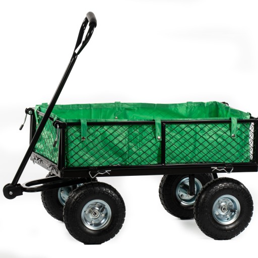 ✅Wózek ogrodowy wielozadaniowy - może służyć jako wózek, taczka, transporter a nawet przyczepka. Jest pomocny w pracach ogrodowych (transport ziemi, liści, gałęzi, jabłek), polowych (transport nawozów, produktów rolnych) lub do przewożenia drewna i węgla do kotłowni. Wózek posiada 4 pompowane koła, skrzynię wykonaną ze stali i uchwyt do ciągnięcia. Dodatkowo w wózku znajduje się plandeka, która umożliwia przewożenie materiałów sypkich takich jak: ziemia, piach czy liście. Nie wymaga użycia dużej siły fizycznej, dzięki czemu mogą z niego korzystać także dzieci. Wykonany z wytrzymałych materiałów, pozwala załadować ciężar do 350 kg.
