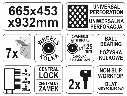 Blat wykonany z solidnego metalu przykrytego antypoślizgową gąbką - maksymalne obciążenie blatu 210 kg. Boczna perforacja umożliwia zagospodarowanie powierzchni bocznych. Wymiary szafki 665 x 453 x 932 mm.