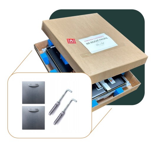 - Jako zestaw każdy klient otrzymuje przyklejone zawieszki do tafli lustra oraz dołączone kołki i wkręty.