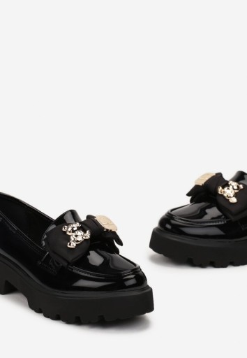 Czarne, lakierowane mokasyny z ozdobną kokardą oraz broszką w złotym kolorze. Modny w tym sezonie motyw misia na butach doda charakteru Twojej stylizacji.