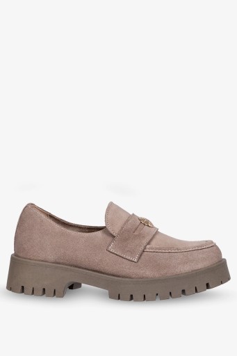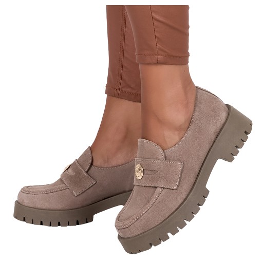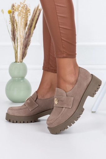 SKÓRZANE LEKKIE MOKASYNY DAMSKIE NA PLATFORMIE ZE ZŁOTĄ OZDOBĄ PÓŁBUTY