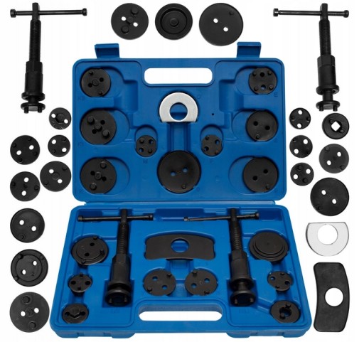 W zestawie znajdują się dwie prasy (prawo i lewo skrętna), dwie różnego kształtu belki do zapierania prasy o siodło zacisku oraz 17 adapterów dostosowanych do wielkości tłoczków hamulcowych stosowanych w większości samochodów osobowych produkowanych na rynku europejskim oraz azjatyckim. Zestaw wykonany z wysokiej jakości stali, zapakowany w solidną plastikową walizkę. Pokrętło wyposażone w magnetyczną końcówkę utrzymującą każdy adapter. Doskonale sprawdza się przy pracy z tłoczkami ceramicznymi.