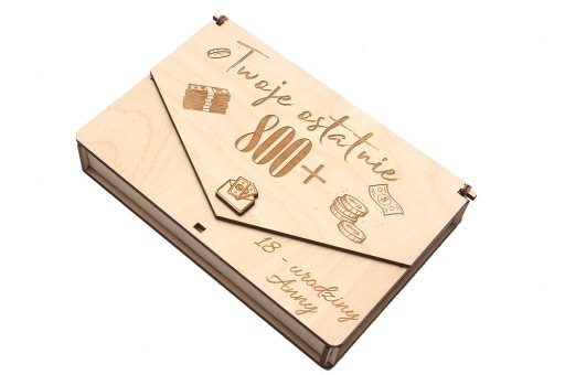 Nasza drewniana koperta na pieniądze ucieszy i będzie ciekawą pamiątką dla solenizanta. Do środka można włożyć banknoty, a wygrawerowane życzenia na wieczku zastąpią klasyczną kartkę.