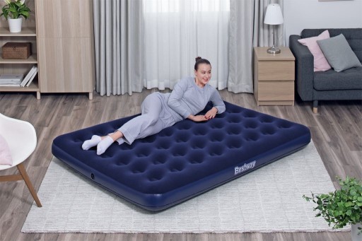 Materac turystyczny Bestway Queen do użytku dwusobowego. Materac został wykonany z wytrzymałego materiału PVC pokryty na górnej części miękkim welurem w kolorze granatowym. Nadaje się zarówno do użytku wewnętrznego jak i zewnętrznego, idealnie sprawdzi się pod namiotem lub w domu jako zapasowe łóżko dla gości.