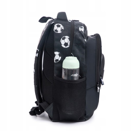 Główna komora plecaka STARPAK została wyłożona specjalną wzmocniona i łatwą w czyszczeniu podszewką. Komora jest bardzo pojemna. Zmieści się w niej wszystko co potrzebne w szkole. Dodatkowo 2 przednie kieszenie ułatwią utrzymanie porządku i poprawią organizację. Z obu stron plecaka umieściliśmy siatkowe kieszenie na butelki z napojem. Kieszenie zostały specjalnie wzmocnione wytrzymałem materiałem.