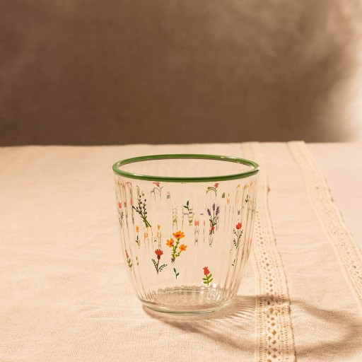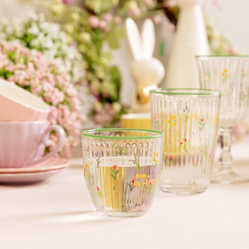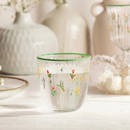 Szklanki to podstawowe naczynia w każdym domu. Korzystamy z nich codziennie, gdy tylko chcemy się czegoś napić. Szklanka GARDINO nie tylko pozwoli Ci cieszyć się dużą porcją ulubionego napoju, ale zapewni mu także piękną oprawę. Wykonana jest z transparentnego szkła, które ozdobiono radosnym wzorem w kolorowe, wiosenne kwiaty oraz zieloną krawędzią.