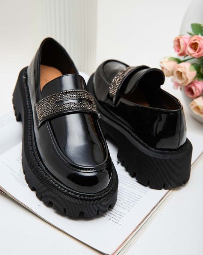 Klasyczne damskie mokasyny na grubszej podeszwie. Model jest wykonany ze skóry ekologicznej lakierowanej. Posiada ozdobę z cyrkonii na nosku. Idealna baza na co dzień!