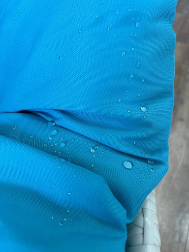 Powierzchnia hydrofobowa odpycha wodę, chroniąc tkaninę przed plamami i zabrudzeniami. Pamiętaj jednak, że przy długotrwałym, intensywnym deszczu może przemoknąć, dlatego zalecamy używanie pokrowca ochronnego.