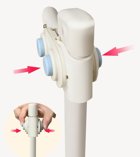 - Poszczególne części stelaża łączą się za pomocą wsunięcia jednej rurki w drugą, a chowany przycisk zapewnia, że nie ulegną samoistnemu wysunięciu się.