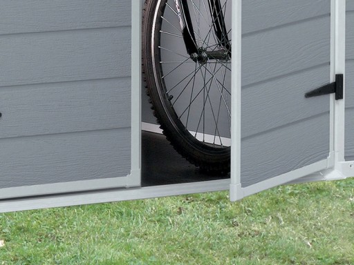 - szerokie podwójne drzwi wejściowe posiadają zamek na opcjonalną kłódkę, co pozwala zabezpieczyć zawartość domku