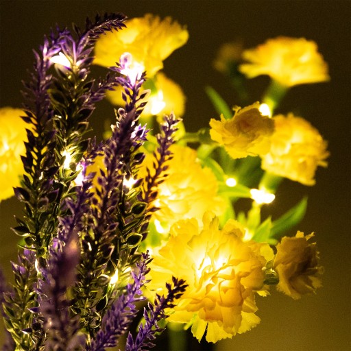 Kolor kwiatów nadaje lampie romantyczny charakter, wprowadzając do ogrodu delikatność. Kolor światła to ciepły biały, co dodatkowo podkreśla przytulny i relaksacyjny nastrój.