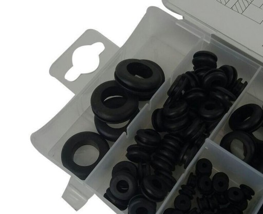 ✅ Przelotki gumowe pakowane są w praktyczne pudełko, ułatwiające organizację według ich rozmiarów.