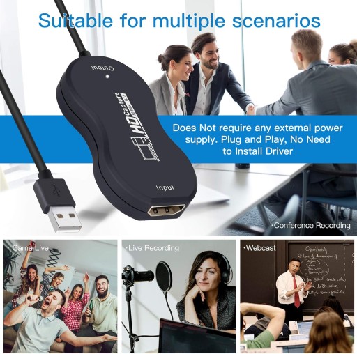 Przechwytywanie wideo HD HDMI: W oparciu o technologię USB 2.0, może przechwytywać jeden jednokanałowy sygnał wideo HD HDMI. Nadaje się do urządzeń z wyjściem HDMI, takich jak odtwarzacz Blu-ray, PS3/4, Xbox One, Wii U itp.