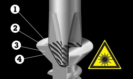 - Końcówki wkrętaków posiadają mikroskopijnme rowki wypalane laserowo, tworząc chropowatą powierzchnie, która dosłownie "wgryza się" w gniazdo wkrętu. Co niweluje przypadkowe wyślizgiwanie się wkrętów ze śrub.