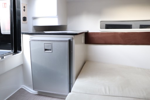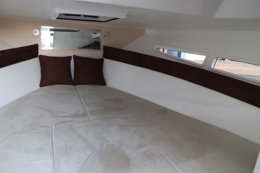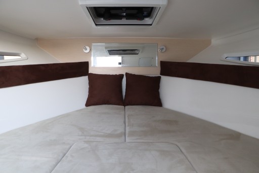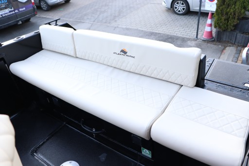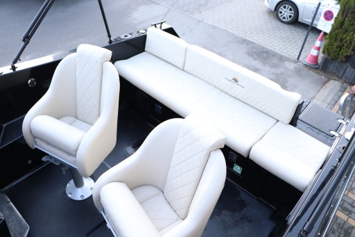 Cała łódź w kolorze czarnym, tapicerka beżowa w pikowaniu, pokrowce (bimini pełne cabrio i plandeka portowa) w kolorze czarnym.