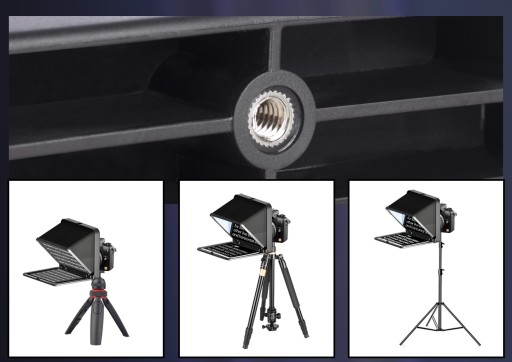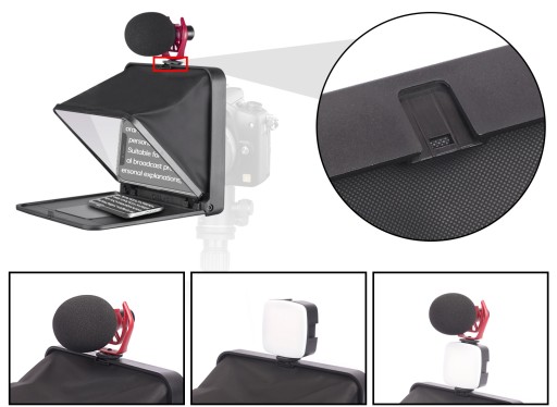 - Teleprompter posiada zimną stopkę typu ISO do zamocowania dodatkowych akcesoriów takich jak lampa LED lub mikrofon