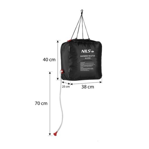 ⚫️NC1713⚫️ marki NILS CAMP to przenośny prysznic turystyczny o pojemności 40 litrów, który jest świetnym rozwiązaniem dla każdego, kto spędza czas podczas campingu, w podróży lub wszędzie tam, gdzie nie ma dostępu do łazienki z ciepłą wodą.