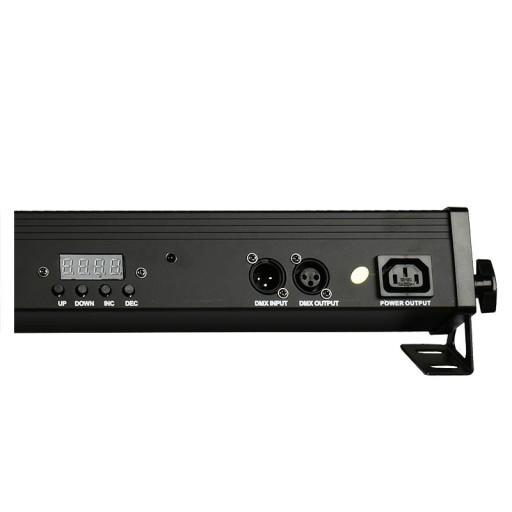 Komponenty oświetlacza LED zamknięte zostały w podłużnej obudowie. Na obu jej końcach znajdują się otwory umożliwiające zamontowanie podstaw, dzięki którym belka może pracować w pozycji stojącej lub wiszącej. Uchwyty pozwalają również ustawić listwę LED pod odpowiednim kątem w stosunku do oświetlanej powierzchni. W górnej części led bara zainstalowane są 64 diody rozmieszczone w dwóch rzędach. Na jednym z boków mieszczą się gniazda zasilania (w tym tzw. „podaj dalej” umożliwiające podawanie napięcia bezpośrednio z urządzenia do urządzenia), 3-pinowe wejście i wyjście XLR dla sygnałów DMX oraz panel sterowania w postaci czterech przycisków i cyfrowego wyświetlacza LED. Za ich pomocą możemy ustawić kolor statyczny, którym wall washer będzie oświetlał interesującą nas powierzchnię, lub wybrać jeden z czterech trybów pracy urządzenia: