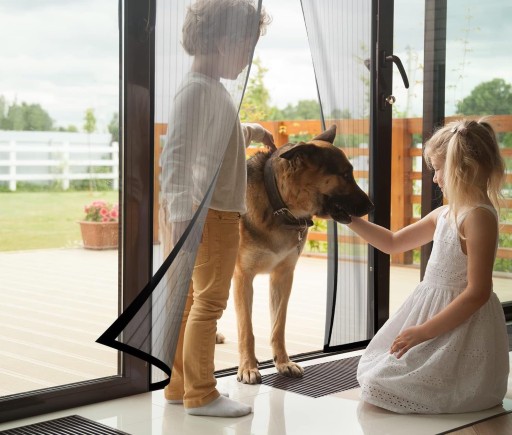 PRZYJAZNE DZIECIOM I ZWIERZĘTOM: Przesuwne drzwi parawanowe pozwalają dzieciom z łatwością wchodzić i wychodzić przez drzwi. Kurtyna magnetyczna pozwala psom wychodzić na zewnątrz, działając prawie jak drzwi parawanowe z wbudowanymi drzwiami dla psów.