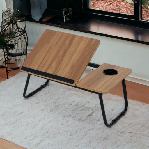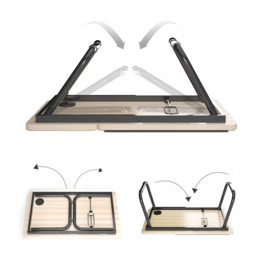 Składany stolik pod laptop, tablet lub książkę Cechy produktu: - Składane nóżki; - Specjalne zagłębienia w blacie, idealne do umieszczenia kubka z ulubionym napojem; - Wygodny mechanizm pozwalający na podniesienie jednej części stolika. Wymiary: Wymiary blatu: 56 x 32,5 cm Wysokość: 23 cm Produkt spakowany w pudełko jednostkowe o wymiarach: 59x40x9,5 cm, waga: 2,16 kg