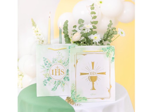 Duża torba prezentowa, o wymiarach 26 cm szerokości, 32 cm wysokości i 12 cm głębokości, to doskonały wybór do eleganckiego pakowania prezentów na różnego rodzaju uroczystości, takie jak Komunia, Chrzest, Bierzmowanie czy wesele. Jej białe tło jest ozdobione złotym nadrukiem kielicha i Hostii, które mają metaliczne wykończenie, nadając im blasku i wyjątkowego charakteru.