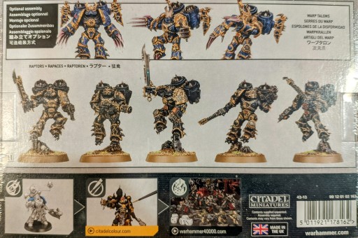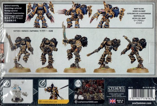 This multi-part plastic boxed set contains 116 components, five 32mm round bases, and a Chaos Space Marine Transfer Sheet, with which to build 5 Chaos Space Marines Raptors or 5 Chaos Space Marines Warp Talons.