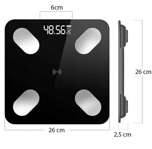 - Wymiary wagi: 26 x 26 x 2,5cm