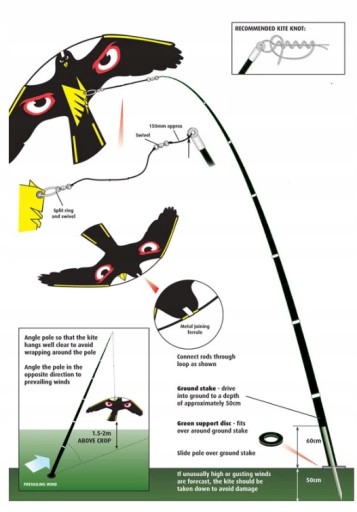 - latawiec wznosi się w powietrze już przy wietrze o prędkości 2km/h, makieta unosi sie w nieregularny sposób, co uniemożliwia przyzwyczajenie się ptakom do jego obecności,