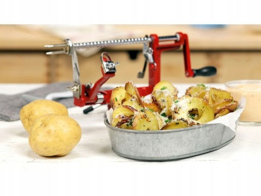 ✅Ręczna maszynka umożliwia w szybki i łatwy sposób pokroić ziemniaka w zakręcone frytki. Są to specjalnie pocięte ziemniaki na patyku, które następnie smażone są w gorącym oleju przez 3-4 minuty i podawane z różnymi przyprawami.