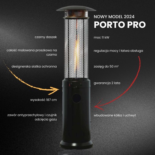 Przedstawiamy Państwu nasz nowy model parasola grzewczego gazowego PORTO. Produkt ten stał się bestselerem w sezonie wiosennym 2024. Popularność uzyskał dzięki wysokiej, jakości wykonania, wysokim parametrom grzewczym i atrakcyjnej cenie. PORTO dostępny w dwóch kolorach brązowym i czarnym swoim wyglądem odzwierciedlał klasyczne parasole grzewcze popularne zarówno wśród indywidualnych użytkowników jak i w branży gastronomicznej (HoreCa) Otrzymaliśmy wiele pozytywnych opinii i podziękowań od zadowolonych klientów. Zebraliśmy również sugestie, co do oczekiwań w zakresie modyfikacji produktu. Po ich przeanalizowaniu nasi inżynierowie opracowali zmiany i modyfikacje, dzięki, którym powstał nowy model tego gazowego parasola grzewczego PORTO PRO – dedykowany na sezon jesienny 2024.