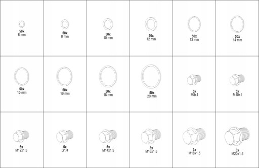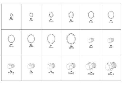 Zestaw 534 sztuk podkładek miedzianych i korków spustowych do oleju + organizer