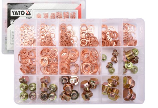 Zestaw 534 sztuk podkładek miedzianych i korków spustowych do oleju.