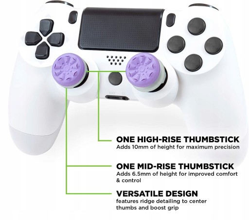 - Poprawiony chwyt: Nakładki są wykonane z gumowego materiału o specjalnej strukturze, co zapewnia lepszy chwyt palca na gałkach analogowych. Dzięki temu kontroler jest bardziej pewny w dłoni, co może przyczynić się do zmniejszenia zmęczenia podczas długich sesji grania.