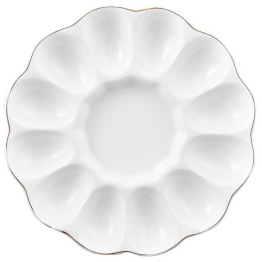 Porcelanowy talerz, tłoczony do serwowania 12 sztuk jaj. Posiada zdobione zlotem brzegi.