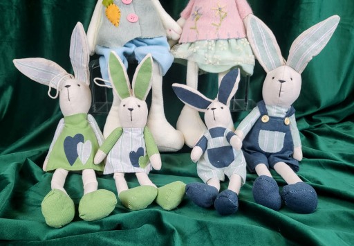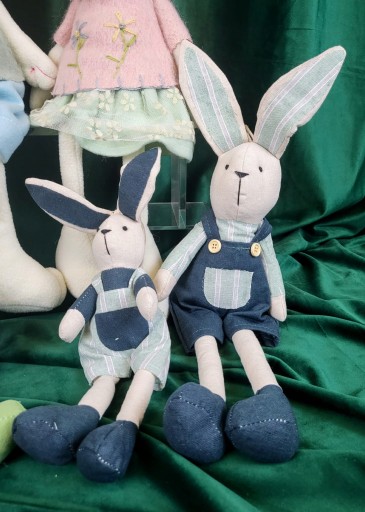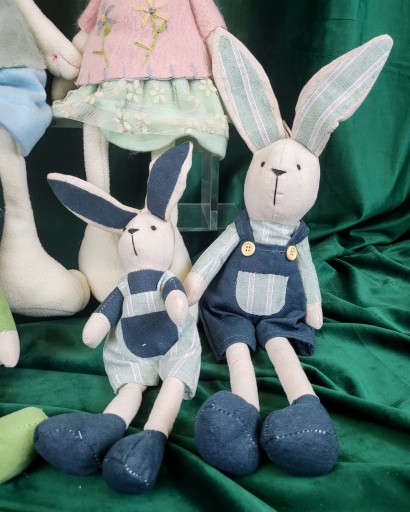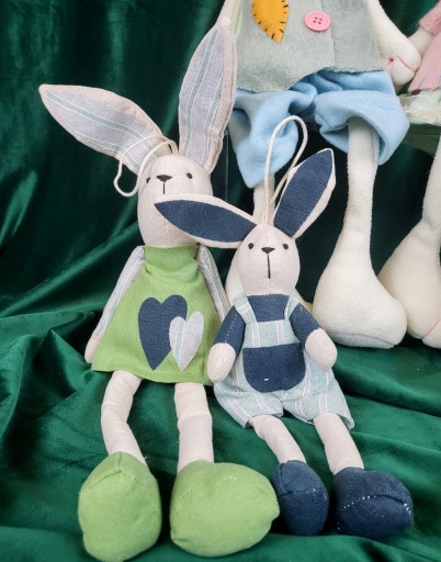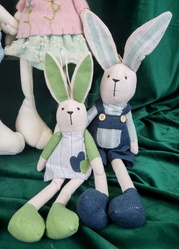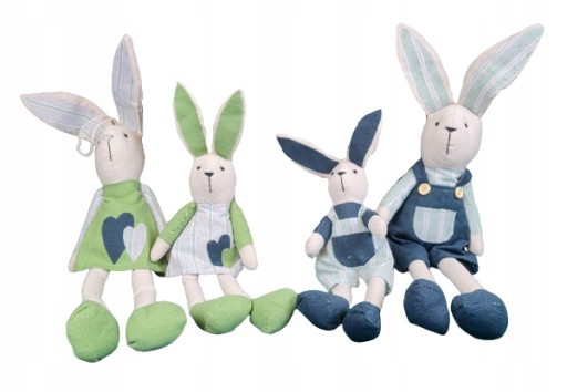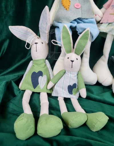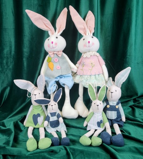 Okazały, niezwykle uroczy, materiałowy zajączek. Materiałowa sukienka lub spodenki podkreślają wyjątkowy charakter ozdoby. Doskonała dekoracja wielosezonowa jaki i świąteczna. Idealna również jako prezent dla dziecka, będzie pięknie prezentować się na półce w dziecięcym pokoju.